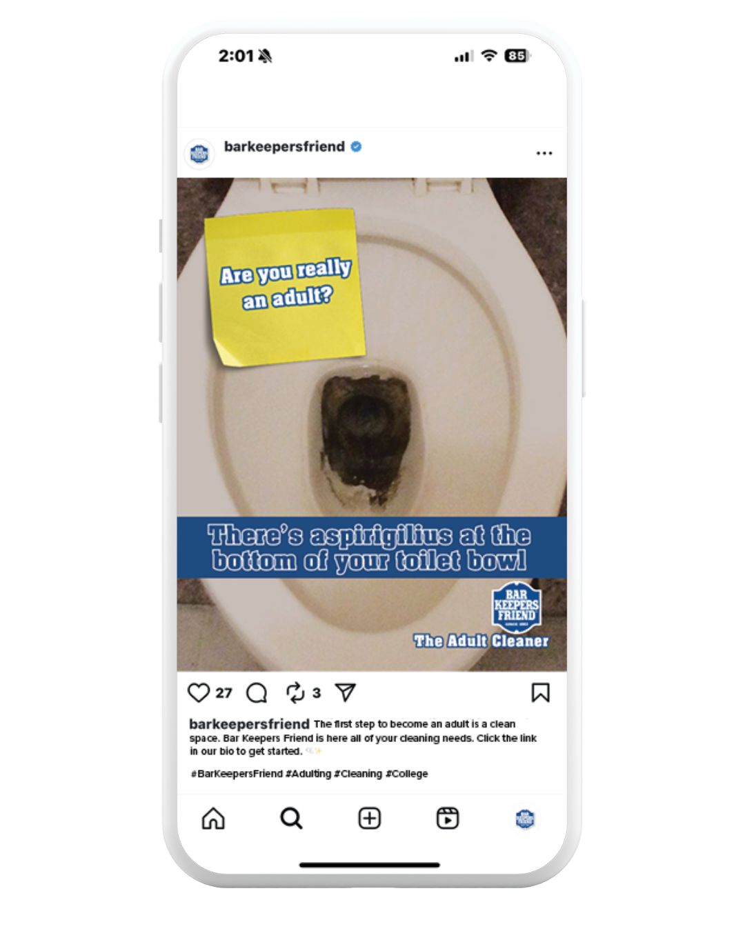 Bar Keepers Friend’s problem does not reside in the product itself, but in the lack of awareness among the younger generations. College students are juggling a lot, school, jobs, relationships, and more, and cleaning is not a priority. As they move into adulthood, learning how to clean is one of their first steps. The disconnect creates the opportunity for Bar Keepers Friend to position themselves as the adult-standard cleaner for college students. They may not have everything together, but at least their space looks like they do.