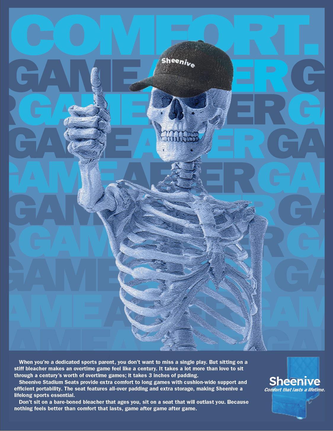 A print ad is an effective way to reach our target audience of parents whose children participate in sports because it can be put anywhere: magazines at nail salons, in a community newsletter, the local paper, etc. The skeleton is eye-catching and the text tells the story about just how long you can be comfortable in the seat.